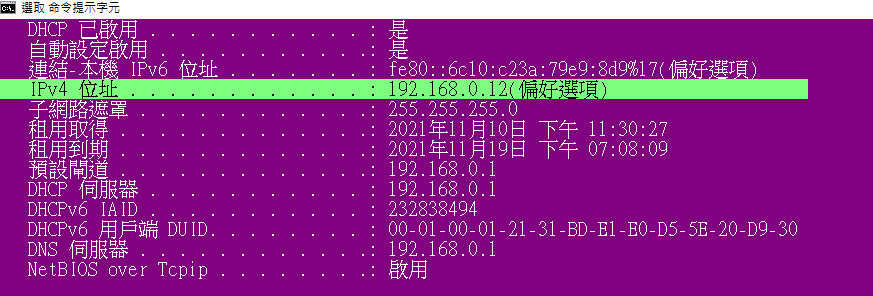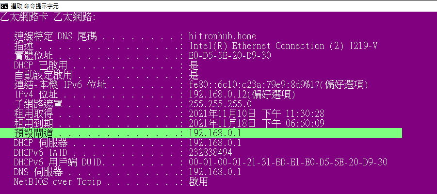 然后看看cmd中的预设闸道消息,192.168.0.1就是路由器IP,不同路由器品牌分配的子网IP会有些不同,不过常见的就是192.168.0.1, 192.168.1.1, 192.168.31.1等