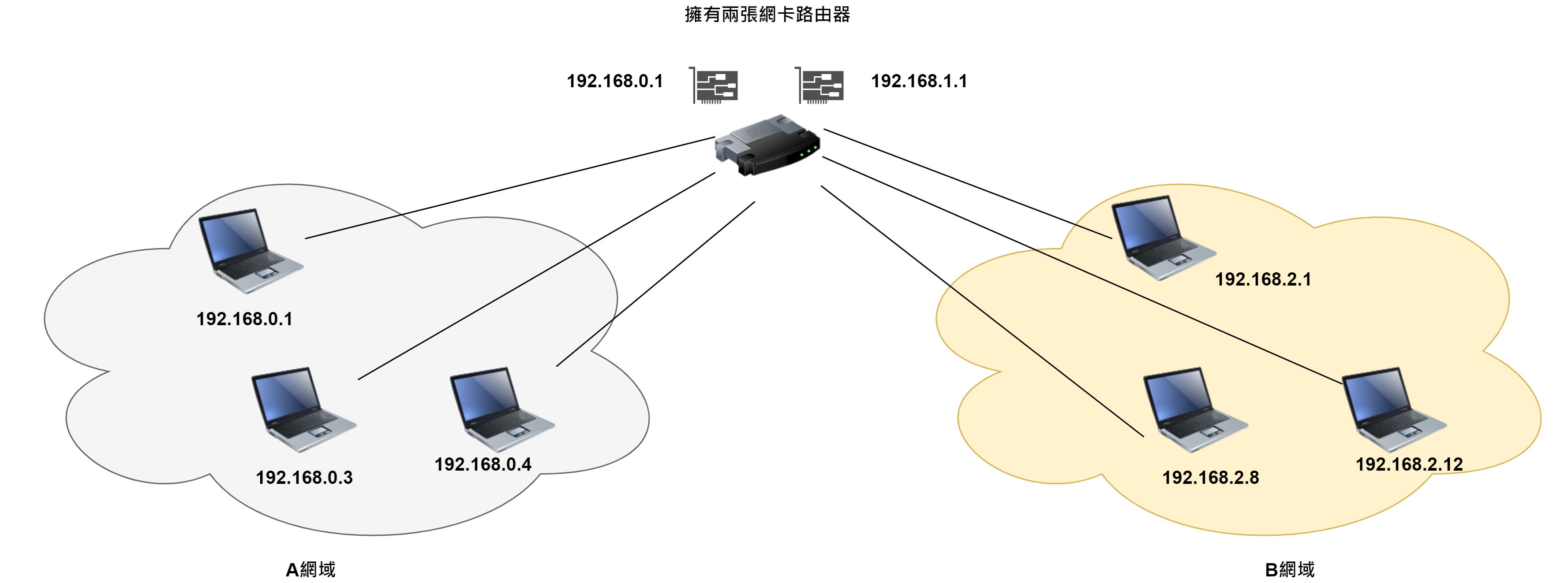 若路由器同时拥有两个网卡,他可以同时代表两个不同的子网系统,例如下图的路由器就代表192.168.0.1与192.168.1.1两个子网