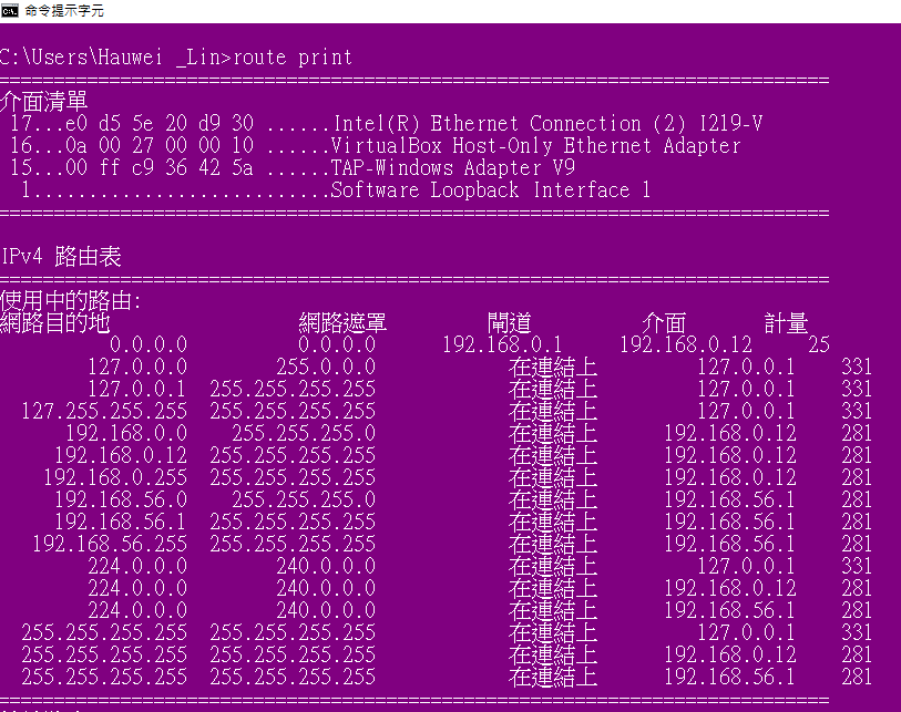在cmd中输入route print指令来查看路由表,我当前电脑的IP为192.168.0.12,若目的地IP地址与网络遮罩栏位AND运算后等于网络目的地栏位中的地址,则将封包发往对应的闸道栏位