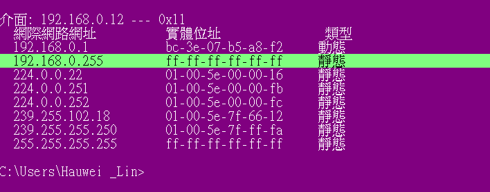 ff-ff-ff-ff-ff-ff为特别保留的MAC地址,只要交换设备发现封包的MAC地址为ff-ff-ff-ff-ff-ff,就会自动将该封包转发给相同网域中除了发送方以外的设备,一般来说接收到广播的设备不用做任何回应了解广播IP的配置方法后,我们可以看看广播地址对应的MAC地址是什么。手动打开cmd,输入arp -a指令来看看[[网络是怎样连接的(十一) 初探IP协议#ARP表|ARP表的内容]],发现广播地址对应的MAC地址是ff-ff-ff-ff-ff-ff