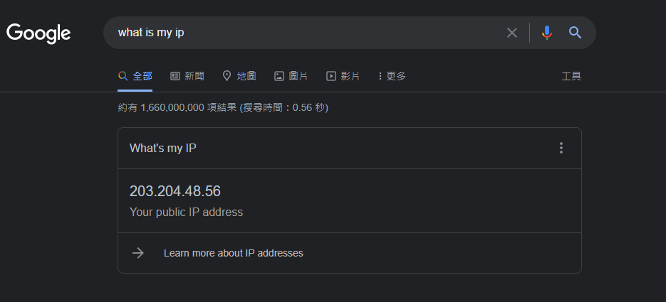首先到Google搜寻页面,打上what is my ip,按下搜寻即可显示你的公有IP地址(你也可以到百度搜寻我的IP)