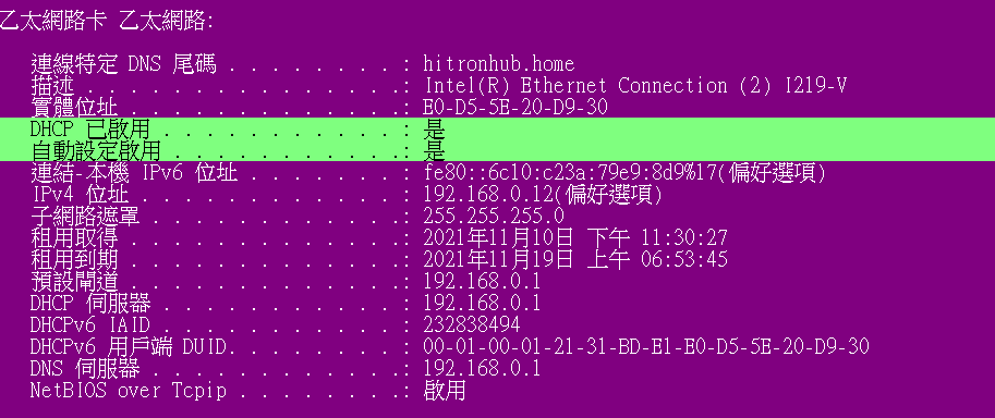 下图显示我的电脑的DHCP配置为启用,也就是说我们在Google上搜寻What is my IP的结果(203.204.48.56)其实是电信业者使用DHCP分配给路由器的一组浮动IP,路由器再使用NAT功能使我可以用这组IP上网