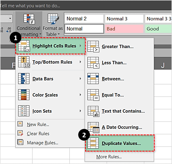 3. 条件格式下,转到突出显示单元格规则,然后转到重复值