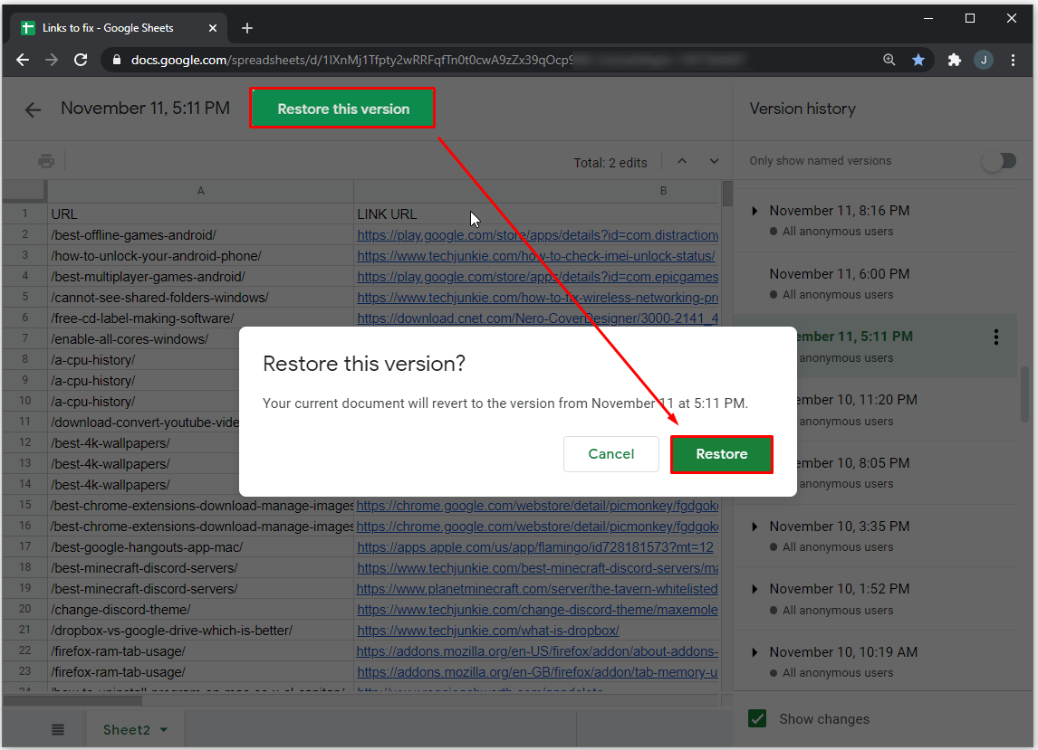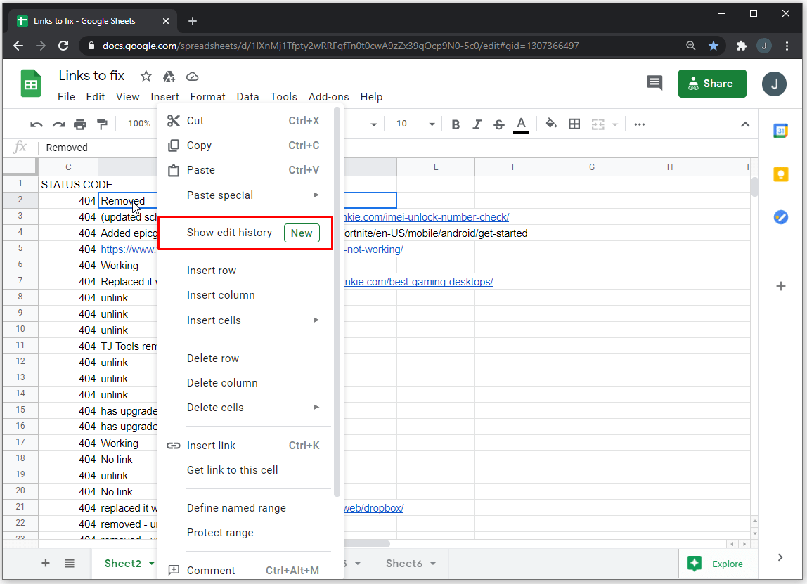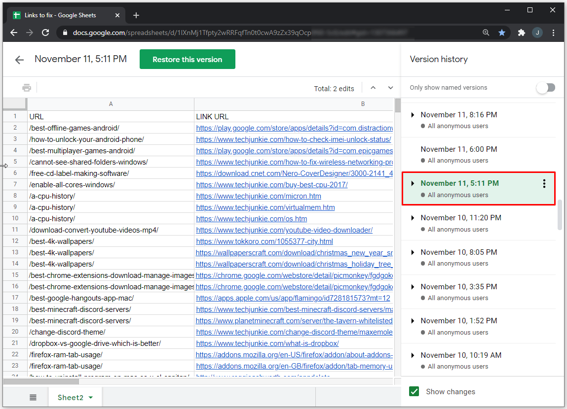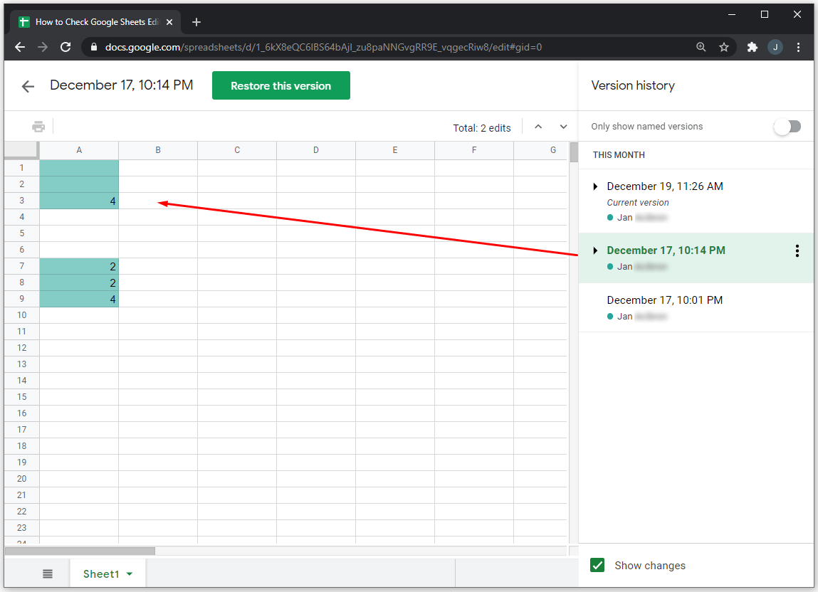 请记住,工作表中的某些更改可能不可见。如果有人添加或删除了行和列,或者更改了单元格的格式,您将无法访问所有更改。但是,您可以使用“版本历史”选项并找到所有必要的信息。