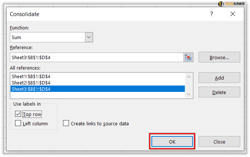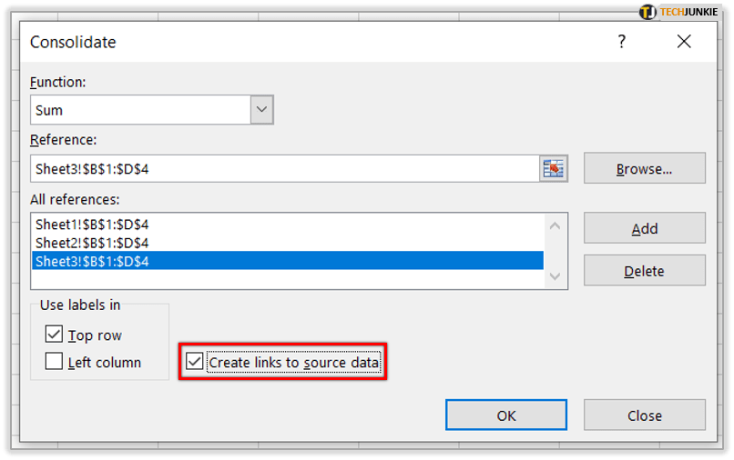 额外提示:如果您将来要更改工作表中的数据,并且希望这些更改也反映在新的合并工作表中,有一个简单的方法去做吧。在单击“确定”之前,请确保选中“创建指向源数据的链接”框,每次更改某些内容时,新工作表都会自动更新。