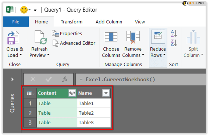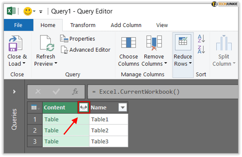7. 将有两列,一列名为 Content,另一列名为 Name(包含您的表的名称)。在内容标题单元格中,您会看到一个双箭头。点击它。