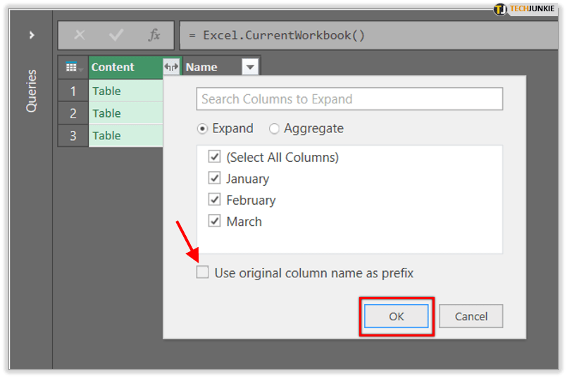 9. 确保未选中“使用原始列名作为前缀”选项,然后单击“确定”。