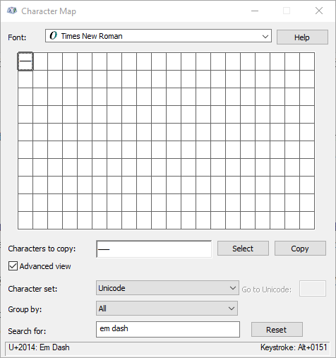 给你有一个字符和符号网格,您可以选择复制到剪贴板。单击高级视图复选框,然后在搜索框中输入“em dash”。按下搜索按钮,然后点击下图所示的短划线框。