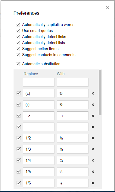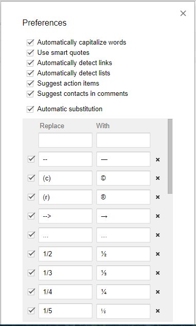 您可以将 Google Docs 配置为自动替换任何输入的字符为长破折号。例如,您可以将文字处理器配置为用破折号替换两个连字符 (--)。为此,请单击工具Preferences 打开下面直接显示的窗口。