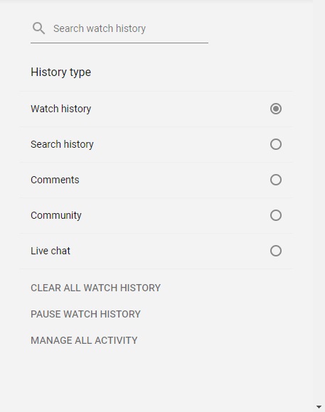 在您点击全部清除按钮之前,您必须选择要删除的历史记录类型。YouTube 将您的观看历史分为五个不同的类别。