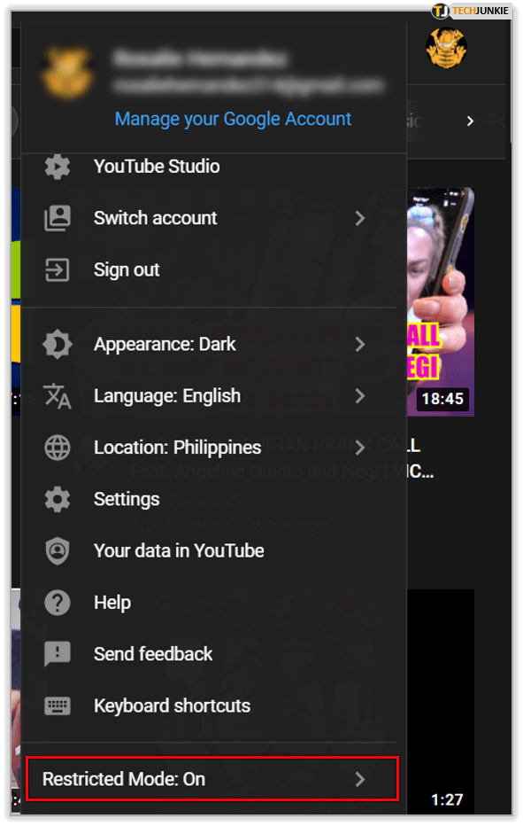 点击它,会出现一个下拉菜单。转到此菜单的底部,您会看到受限模式:开启。单击此处,然后您会看到另一个菜单出现。在此菜单中,单击开关以禁用受限模式。您会看到页面刷新,自动重置 YouTube 的缓存。