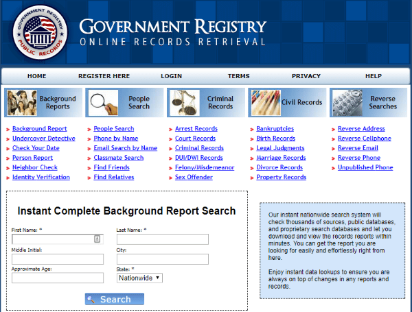 政府登记处通常是您进行自己研究的好地方。它可以搜索多个政府机构的国家数据库,以便您可以在线快速了解您是否有逮捕令。这是一项订阅服务,如果您要进行背景调查而不是自我检查,则它会更有用。