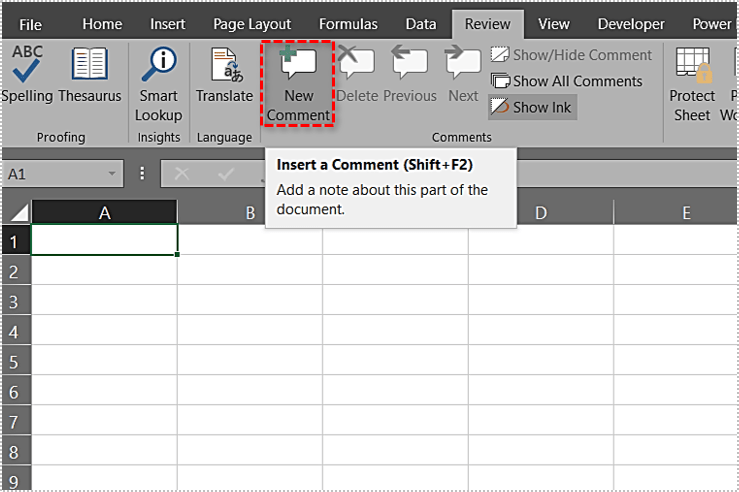 - 进入“评论”选项卡并点击新评论,或右键单击一个单元格并从下拉菜单中选择 Insert Comment。您可以也按 Shift + F2。