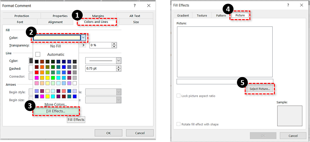 - 在 Format Comment 对话框中,单击到“颜色和线条”选项卡并打开 Color 下拉列表。在底部,点击填充效果。