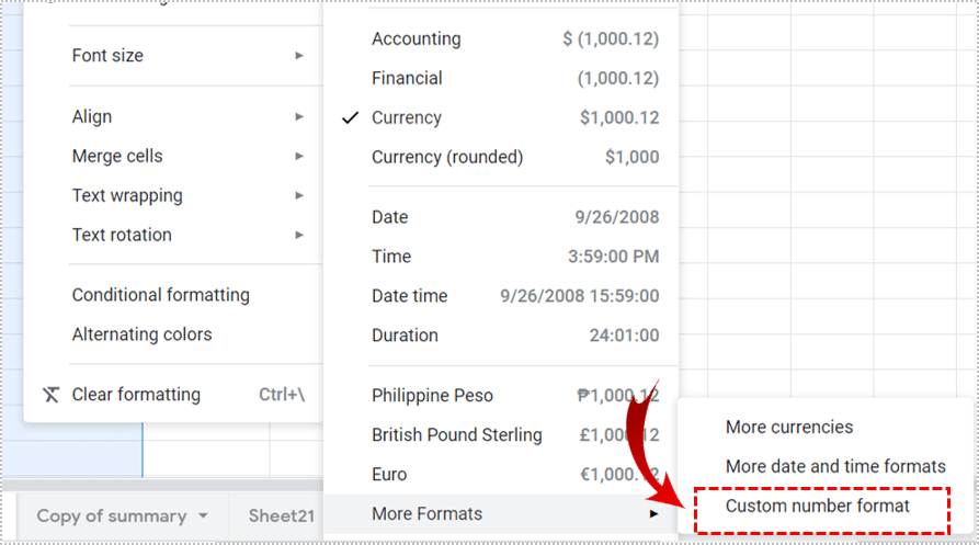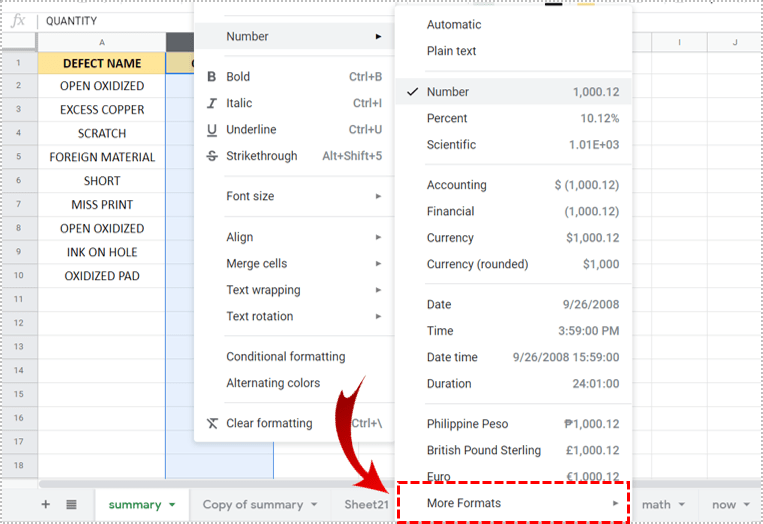 5. 如果您选择了更多格式,请单击自定义数字格式。这将允许您决定将在所选行或列中显示的任何数值的外观。