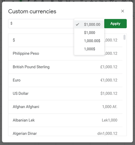 如果您想走更简单的路线,请打开格式,将鼠标悬停在数字上,然后将鼠标悬停在更多格式上单击更多货币。生成的窗口将允许您从任意数量的现有外币中进行选择。只需单击所需的货币,您选择的列、行或单元格将使用它作为其默认货币指示符。