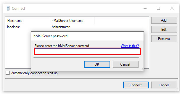 5. 在hMailServer界面,点击localhost,点击<强>连接,然后输入密码。