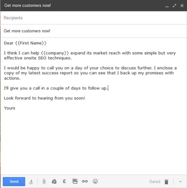2. 添加“亲爱的 {{First Name}” }' 到电子邮件的第一行。您可以将“亲爱的”更改为最适合您的观众的任何内容。这只是为了演示。您还可以使用 {{Salutation}} 并在您的 Google 表格中添加一个称呼列来真正个性化您的邮件。