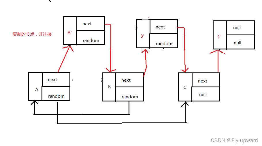 首先我们逐个将节点复制并且和原来的链表连起来得新链表;