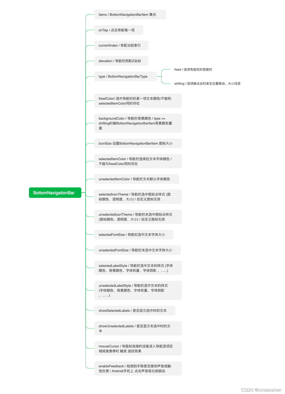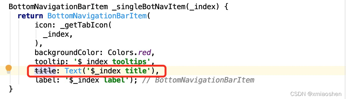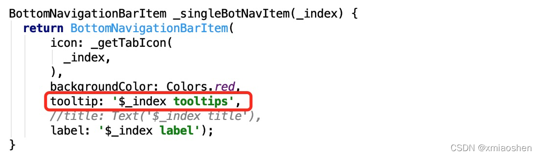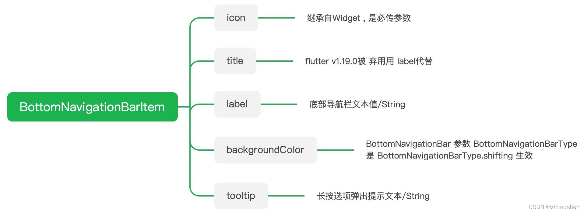 服务于 BottomNavigationBar . 包括属性icon (选项图示)、title (选项包括文本的widget被弃用)、label (导航栏文本值)、backgroundColor、tooltip (长按时选项顶部弹出提示 , 长按选项时选项样式不会发生改变)